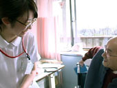 足を心配する患者さんがいました。松本さん、じっくりと患者さんの話を聞き足を観察して、足のはれが引き始めていることを伝えました。患者さんは安心した様子です。