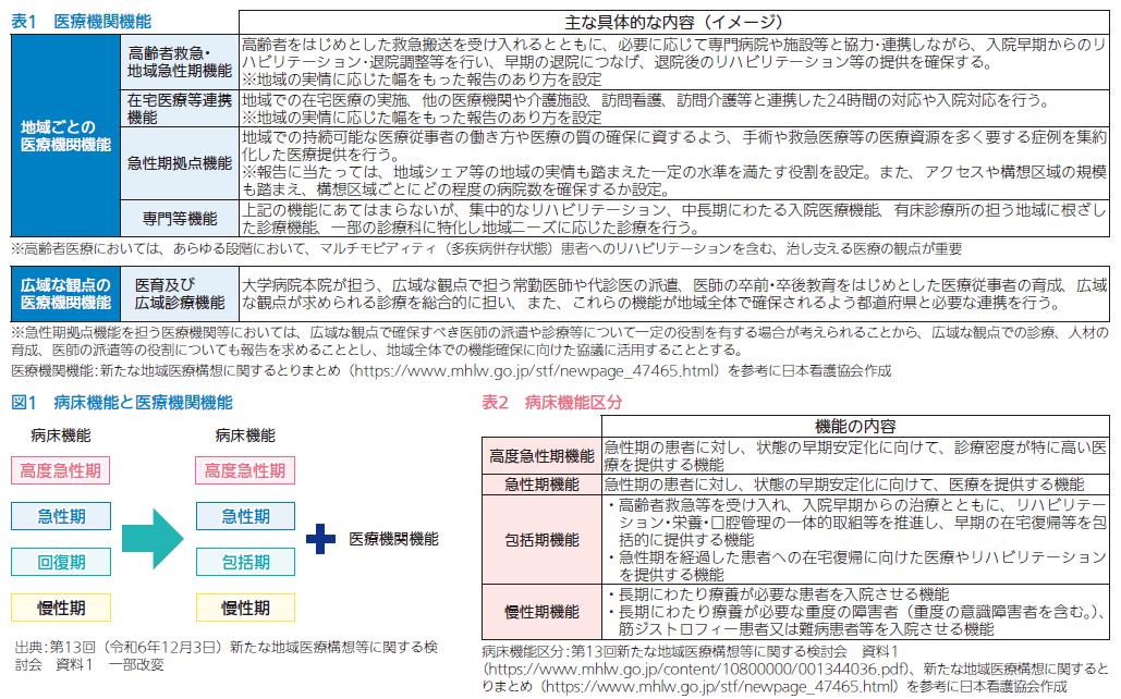 二次医療圏を基礎とした構想区域ごとに、医療機関機能として「高齢者救急・地域急性期機能」「在宅医療等連携機能」「急性期拠点機能」「専門機能」を位置付ける。また、広域的な観点から「医育及び広域診療機能」を位置付ける(表1、図1)。