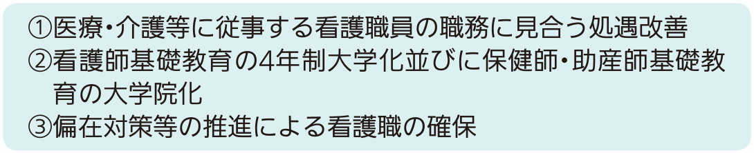 また、人々の安全・安心を支えるため、看護職の役割と活躍の場はこれまで以上に拡大し、高度化していることから、看護実践能力の向上が不可欠であり、基礎教育の強化は喫緊の課題である。そして将来にわたっては、地域で必要な看護職を確保するため、偏在是正をはじめ総合的な対策を速やかに講じる必要がある。こうした課題に対応するため、下記3点を重点要望事項として掲げ、看護提供体制全般に係る全11項目を要望した。