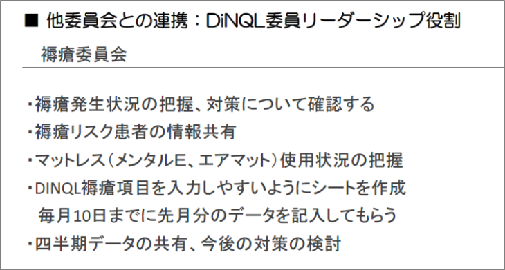 具体的には、「他委員会メンバーと連携して、取り組み課題を絞り込む」「毎月のデータについて、現状と課題を明確にして、DiNQL他メンバー・他委員会メンバーと共有し、評価を行う」こと、また「スタッフ全員に課題や現状、病棟目標と照らし合わせ、目指す姿、目標を共有する」ことを目指して活動するようにしました。