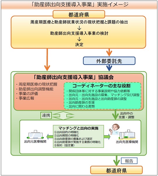 都道府県内の周産期医療と助産師の就業先の偏在状況を把握した上で、助産師の出向・受入れを実施し、地域における助産師の偏在是正、助産実践能力の強化支援、助産学生の実習施設の確保等を図ることを目的としています。