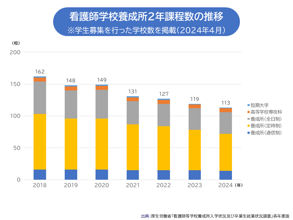 全国には2年課程(全日制・定時制)が99校、2年課程(通信制)が14校あります(2024年4月時点)。2023年度では全日制と定時制では2,730人、通信制では2,479人が看護師資格を取得しています(第113回看護師国家試験合格者数)。しかし、准看護師の養成数の減少とともに、全日制、定時制、通信制のいずれの学校数も次第に減少しています。