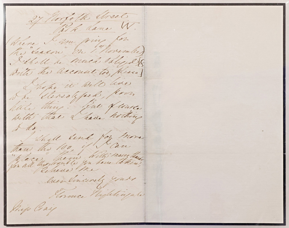 インドに駐在するイギリス軍の衛生状態の改善を目指していたナイチンゲールは、インドの全駐屯地から統計資料を収集し全2巻、2,028ページにも及ぶ「インド駐在陸軍の衛生状態に関する勅撰委員会」の報告書にまとめた。1863年に報告書の要約と意見を加えた23ページの「How people may live and not die in India」を作成した。これは木版画を掲載するなど読みやすいものとなっているが、余分に費用がかかり大蔵省が異議を唱えたためナイチンゲールは私費で印刷し、一部は女王を含む有力な知人に送付している。手紙にあるパンフレットとは「How people may live and not die in India」と思われ、この出来上がりに満足したナイチンゲールが印刷会社勤務していたと思われるクレーグ嬢宛に出した手紙である。
