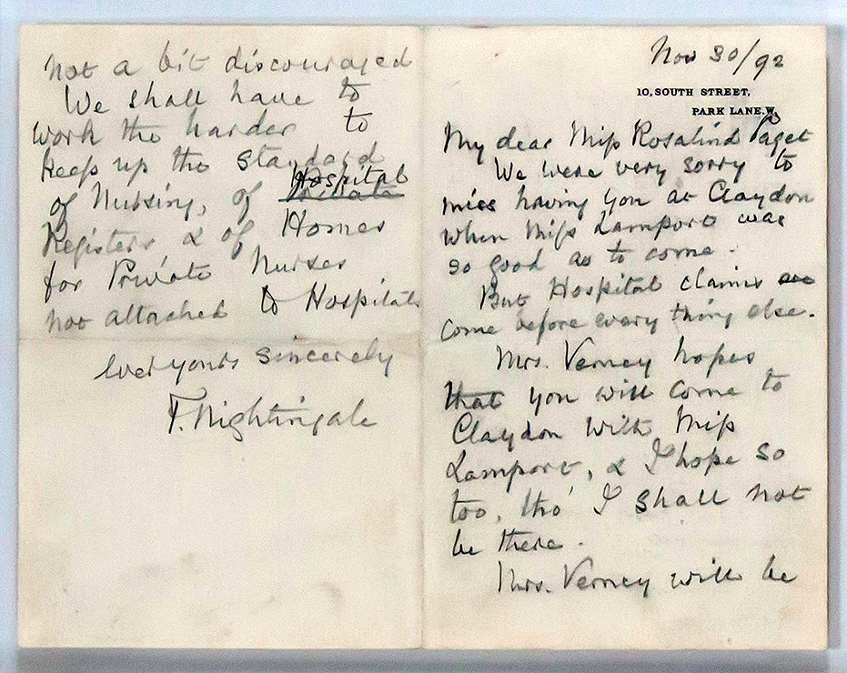 書簡の冒頭にあるクレイドンは、バッキンガムシャーにある、姉パスィノーブの嫁ぎ先であるハリー・ヴァーネイ卿の邸宅があった場所である。姉パスィノーブが結婚したときには、すでにハリー・ヴァーネイ卿には成人した3人の息子と1人の娘がいた。姉パスィノーブは1890年に死去したが、その後も、ヴァーネイ家との関係は続き、ナイチンゲールは、クレイドンを「第2の故郷」と呼んでいる。当時ナイチンゲールは72歳。1892年、クレイドンの村々で村の母親たちに家庭保健の基本原理を指導できるような職種として「保健指導員」の運動を始め、翌年には、「Sick–Nursing and Health–Nursing. 」(病人の看護と健康を守る看護 1893年)を、翌年には「Health Teaching in Towns and Villages」(町や村での健康教育 1894年)を表している。また、1886年からイギリスでは「看護婦登録制度」に関する論争が始まり、ナイチンゲールは、登録制度そのものを否定してはいなかったが、「まだその機が熟していない。あと40年もすれば、職業看護もそれに相応しい段階に達するであろう」「試験のみによって看護婦の資格を認定しようとするもので、技術の習得と同等の重みを置いた人格の鍛錬というものを全く無視している」という2つの理由で反対している。手紙はパジェット嬢の働くロンドン病院の総婦長であり、同じく登録制度に反対をしていたリュックス嬢によろしく伝えてほしいと結んでいる。※1※2