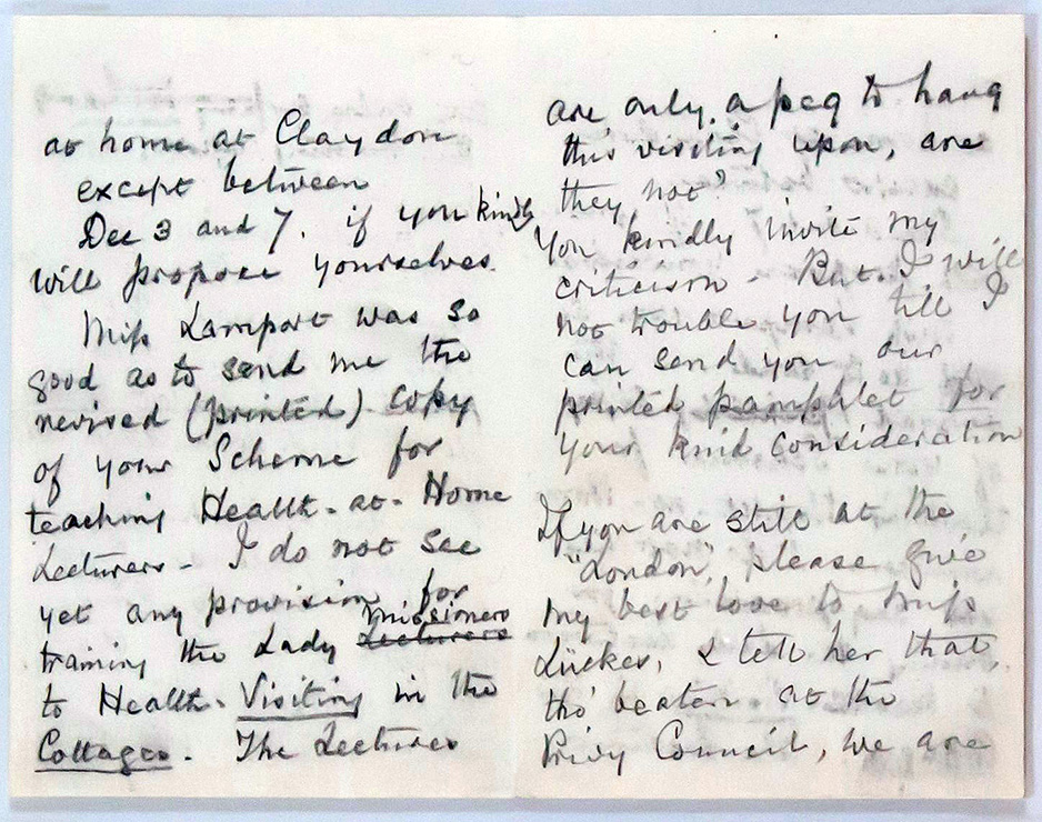 Mrs. Verney will be at home at Claydon. except between Dec. 3 and 7, if you kindly will propose yourselves,Miss Lamport was so good as to send me the revised (printed) copy of your Scheme for teaching Health—at—Home Lecturers—I do not see yet any provision for training the Lady Missioners to Health, Visiting in the cottages. The lecturers are only a peg to hang this visiting upon, are they not ?