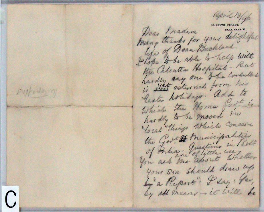 Many thanks for your delightful life of Dean Buckland. I hope to be able to help with the Calcutta Hospital. But hardly any one to be consulted is yet returned from his Easter holidays. Add to which the Home Foot is hardly to be moved in “local” things which concern the Governor Municipalities of India. Questions in Paatt are of little use. You ask me about whether your son should draw up “a Report”. I say: Yes, by all means—it will be of use, to send to any one but not without enquiry. It would run the risk of being “considered” which means pigeon–holed.