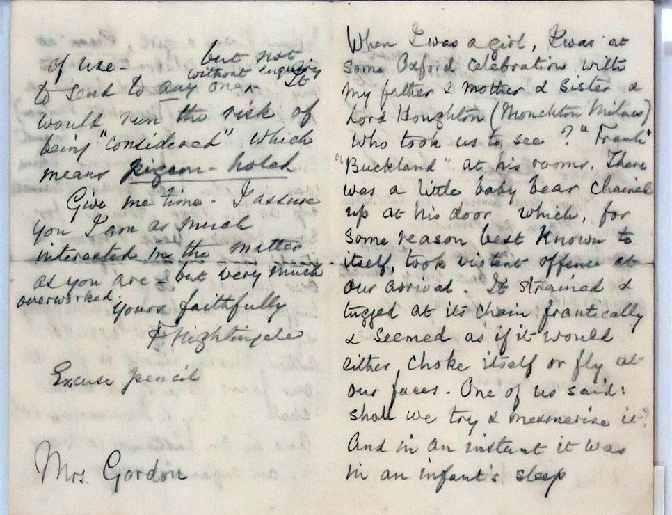 When I was a girl, I was at some Oxford celebration with my father & mother & sister & Lord Houghton (Monckton Milnes) who took us to see? “Frank” “Buckland” at his rooms. There was a little baby bear chained up at his door which, for some reason best known to itself, took violent offense at our arrival. It strained & tugged at its chain frantically & seemed as if it would either choke itself or fly at our faces. One of us said: Shall we try & mesmerize it ? And in an instant it was in an infant's sleep.