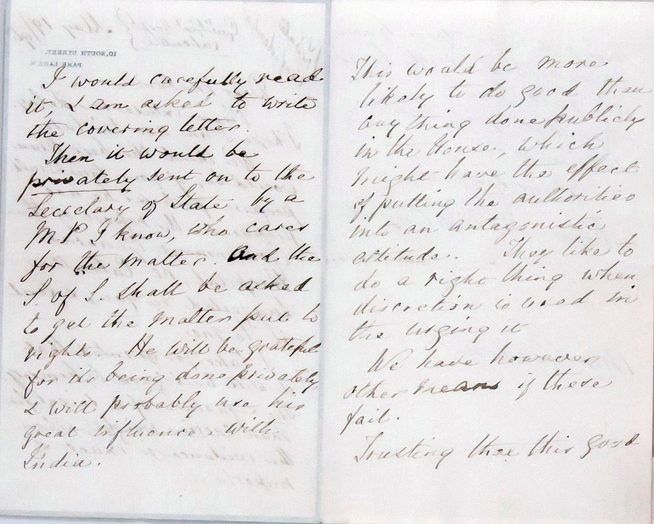 Then it would be privately sent on to the Secretary of State by a MP I know, who cares for the matter. And the S of S shall be asked to get the matter put to rights. He will be grateful for its being done privately, & will probably use his great influence with India.