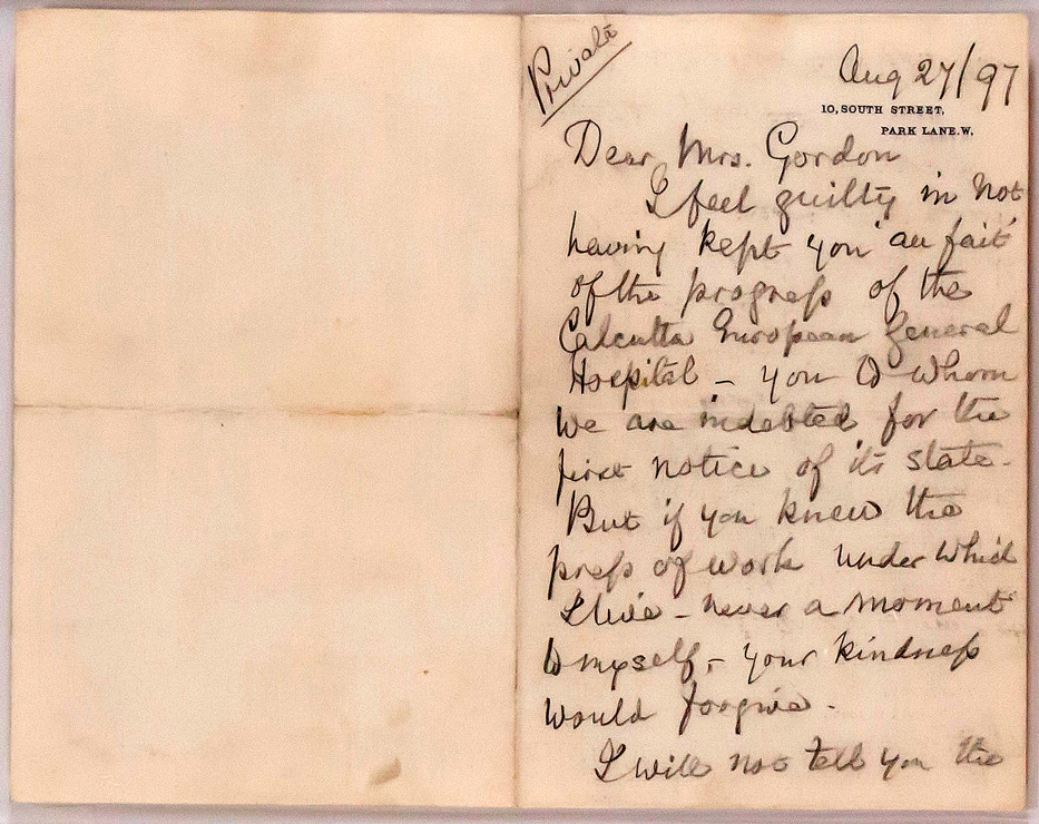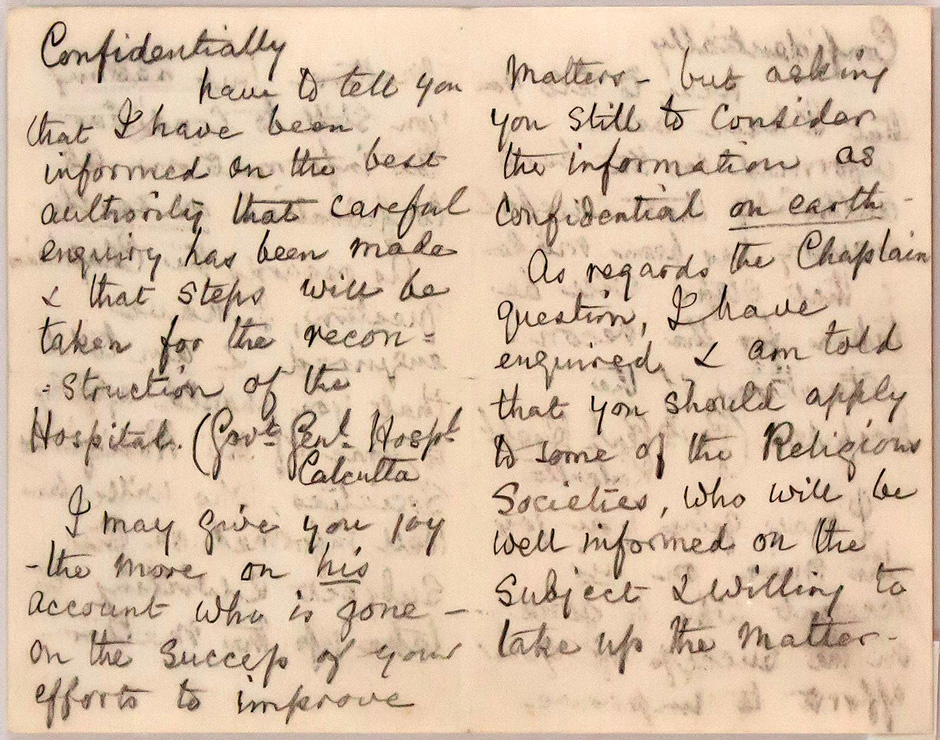 The best comfort I know that I can give you and what would have pleased him could he have known it—perhaps he does know it—is what I confidentially have to tell you that I have been informed on the best authority that careful enquiry has been made and that steps will be taken for the reconstruction of the Hospital(Government General Hospital, Calcutta). I may give you joy the more on his account who is gone, on the success of your efforts to improve matters, but asking you still to consider the information as confidential on earth.