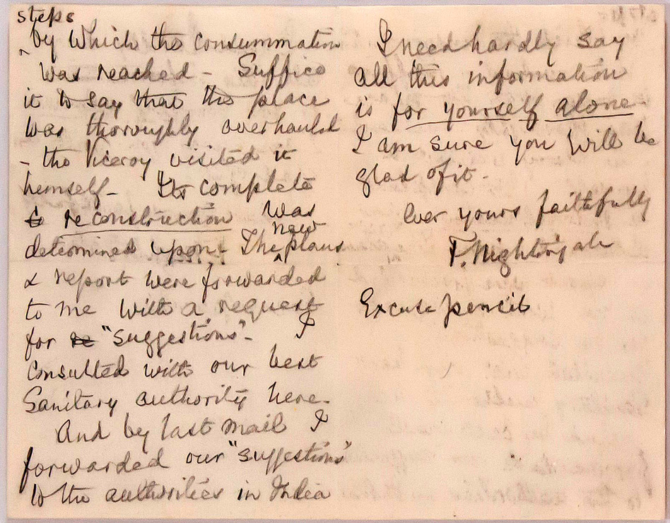 目的が成就された過程をひとつひとつ申し上げることはいたしません。病院が総点検を受けることになり、総督自身が自らそこを訪れて、全面的な再建が決定されたことをお伝えすれば十分かと思います。それに関する新しい計画案と報告が私に「示唆」を求める要望とともに転送されてきました。私はこの国の最も衛生に関する優れた権威者と協議して、最後にお送りしたお手紙でインドの当局者に私たちの「示唆」をお送りしたところです。