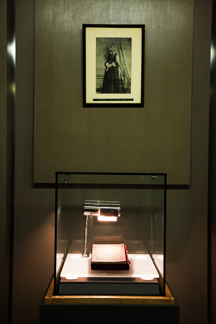 ナイチンゲールがクリミア戦争中に使用したランプ、飼っていたフクロウ「アテナ」のはく製、生家などの写真が掲載