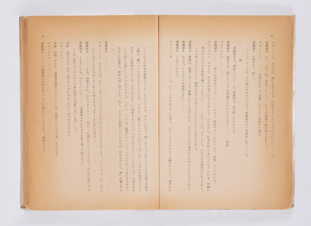 本会では、ナイチンゲール記念事業として、昭和33年(1958)5月15・16日に劇「フロレンスナイチンゲール」五幕を銀座ガスホールで上演した。協会ニュース29号(昭和33年7月1日)には、「シナリオの実費配布を計画中」という記事があり、希望者を募っている。また、雑誌『看護』10巻7号口絵(1958年)には上演時の様子が紹介されている。
