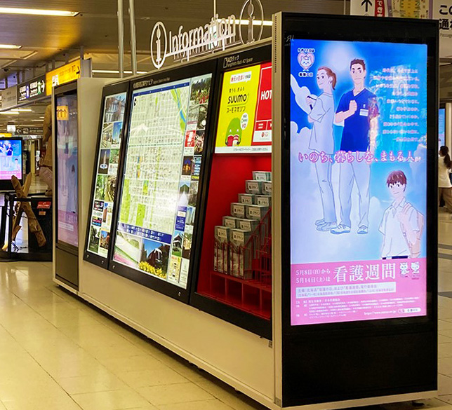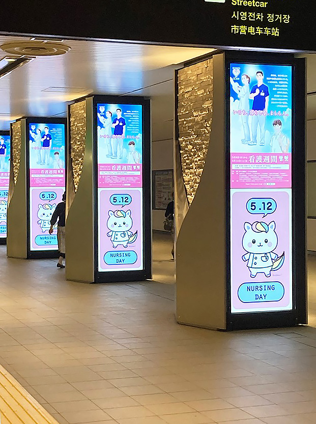 また、道民に向けて看護協会の活動を理解していただくために、デジタルサイネージを利用したPRを看護の日・看護週間に合わせて、札幌市内でも人通りが多く広報が目にとまりやすい札幌駅西口と地下鉄大通駅のコンコースで実施しました。