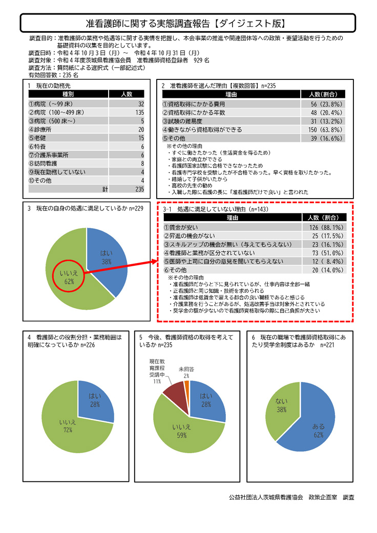 返信用封筒を同封した質問紙による選択式(一部記述式)を全准看護師会員929名に送付し有効回答235名分(回収率28.2%)の現場のリアルな意見を得ることができました。