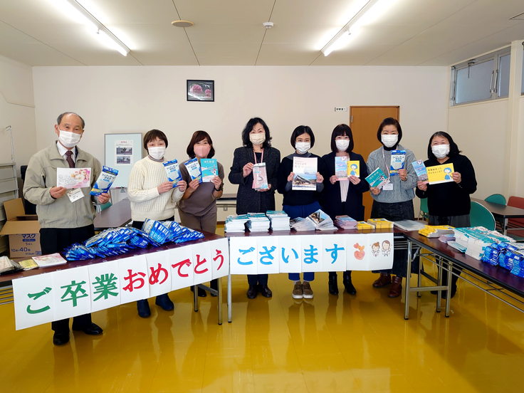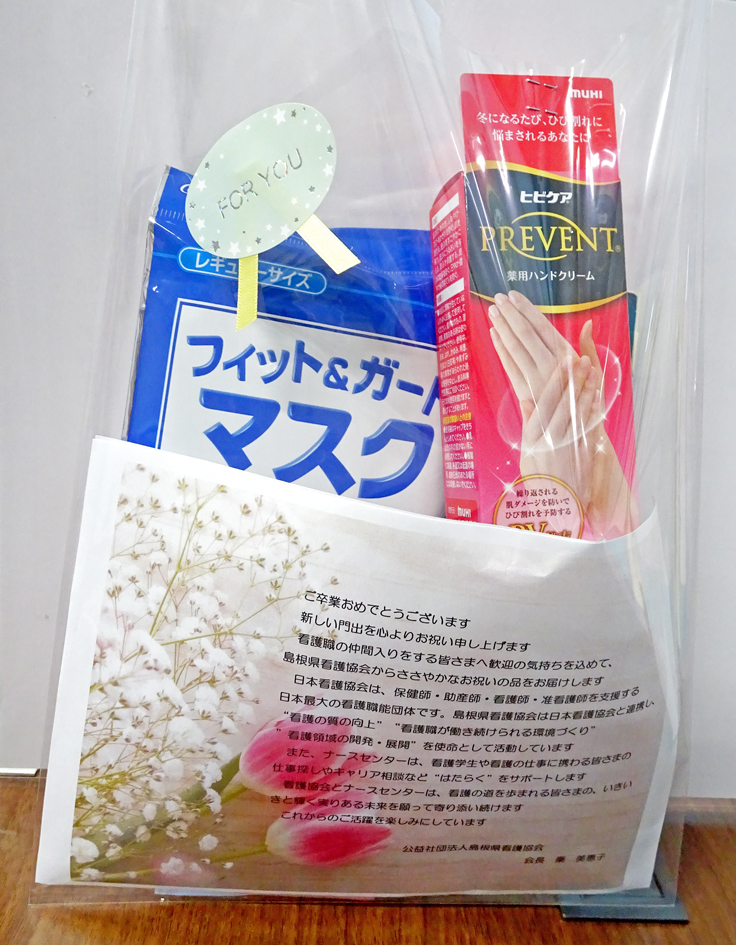 毎年、島根県内のすべての看護師等養成所11校の卒業生全員にお祝いグッズを添えて協会長からのお祝いメッセージをお届けしています。