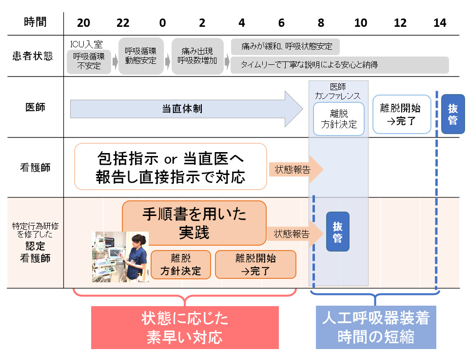 特定行為の実施による「患者の状態に応じたタイムリーな対応」と「人工呼吸器装着時間の短縮」によって、人員が充実した時間帯での抜管やその後の状態観察の時間を十分に確保できるなど、安全な医療の提供にも貢献することができた。