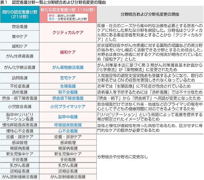 今回、統合する分野は救急看護と集中ケア、緩和ケアとがん性疼痛看護です。また、活動の広がりや現状の役割を考慮し9分野の分野名を変更し、全19分野としました。