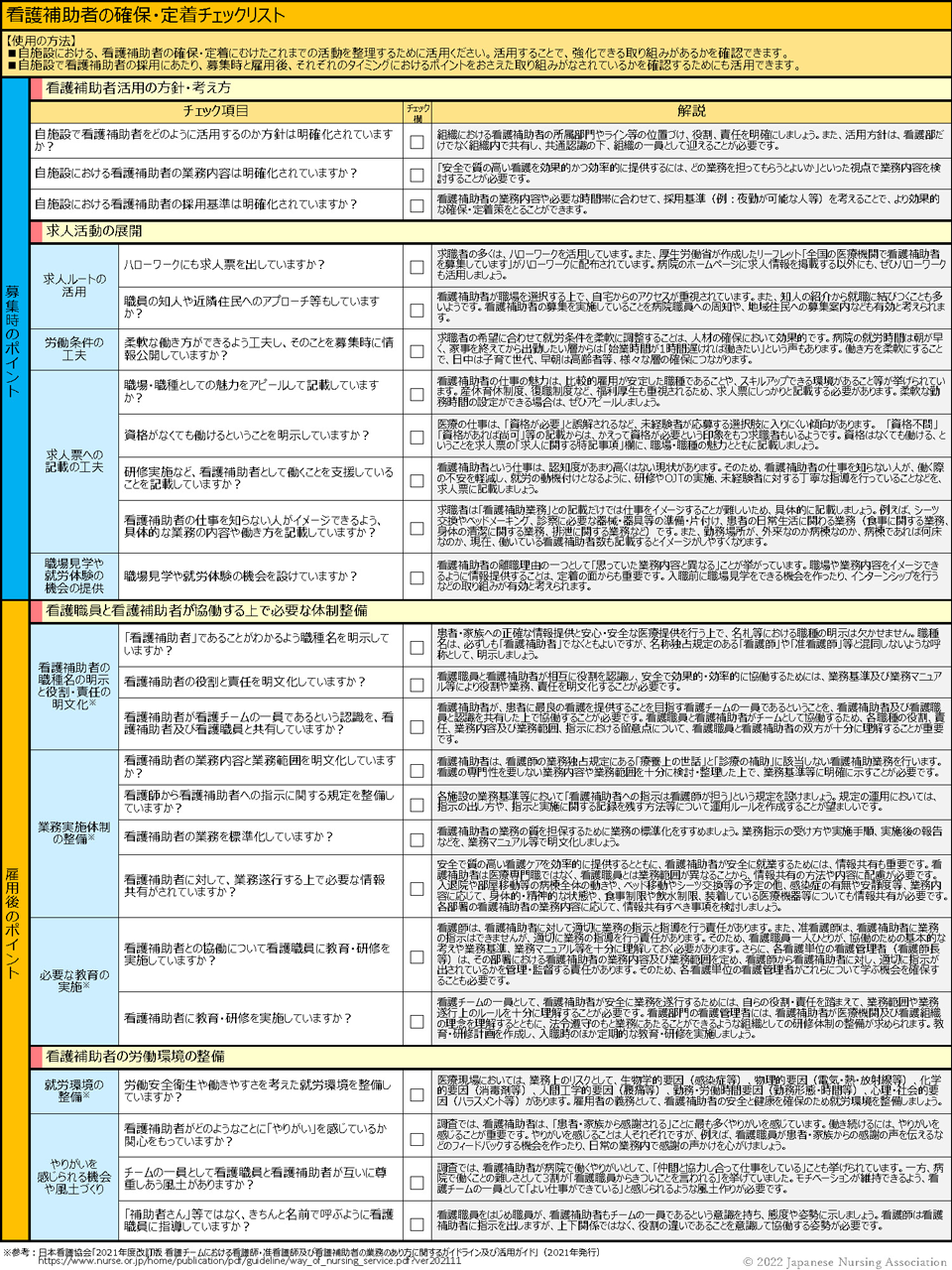 自施設における、看護補助者の確保・定着に関する活動の整理やポイントの確認にご活用ください。