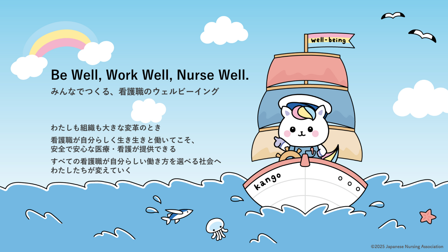 日本看護サミット2025(2026年2月5日開催、テーマ「ウェルビーイング時代の働き方革命」)において、ウェルビーイング号に乗る「看護の日」キャラクターのかんごちゃんとともに、看護職の働き方革命を推進するスローガンを公表しました!