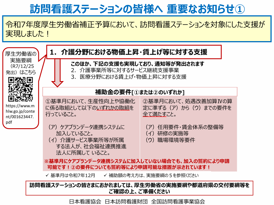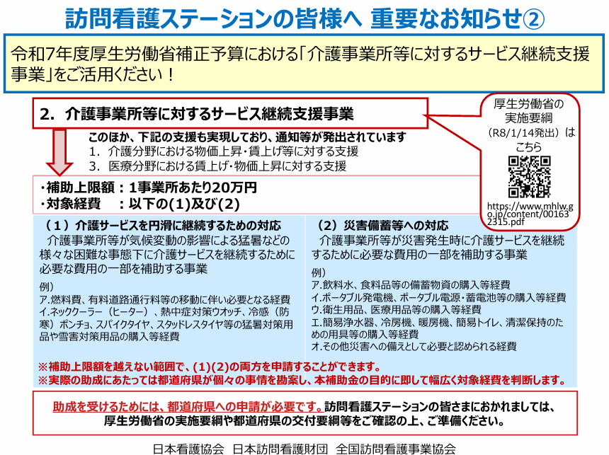 訪問看護事業所の皆さまにおかれましては、下記通知のご確認をお願いします。【情報提供】訪問看護事業所を対象にした給付金・助成金事業について
