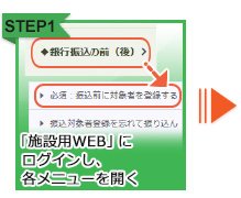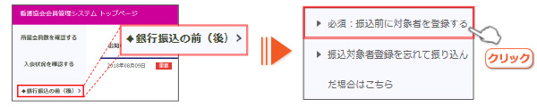 トップページのメニューから「銀行振込の前(後)」を選択し、「必須:振込前に対象者を登録する」をクリックします。