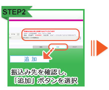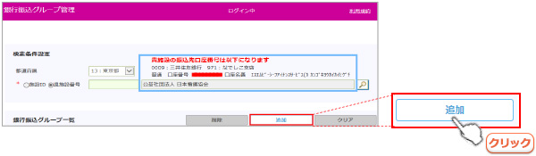 振込先の施設専用口座を確認し、「追加」ボタンを選択します。