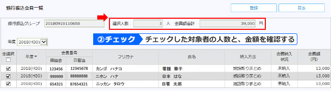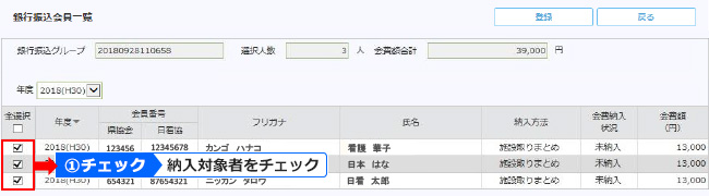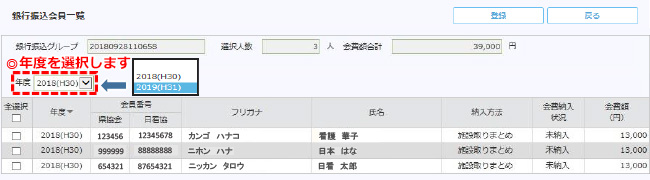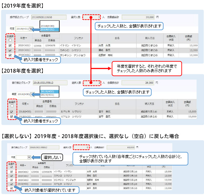 対象となる年度を確認の上、会費納入対象者を特定(チェック)します。